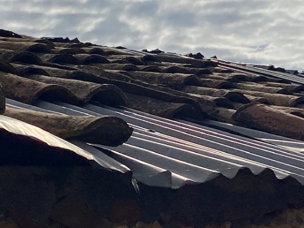 Meine Kamera streifte ein Dach, das den Himmel nur mühsam vom Raum darunter abschließt. Solche Dächer gibt es hier in den Dörfern viele: wo die schönen alten Ziegel nicht mehr halten, muss es welliges Eternit oder Blech tun. Ob noch Menschen darunter leben, weiß ich nicht.