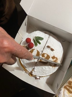 Ja, es hat geschmeckt. Aber vor allem ist dies Zusammensein schön, dieZuteilung der Stücke, die nicht ernstgenommene Spannung, wem die Münze zufällt … halt all das Drum und Dran. Wir machten natürlich auch Fotos, die die gute Stimmung widerspiegeln, die ich leider hier nicht zeigen kann,