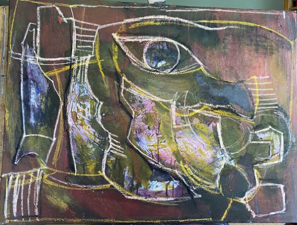 Auf der Staffelei steht ein großes Bild, das ich kürzlich aus einem Stapel zog. Jede Woche ist es ein anderes. Ich ziehe es blind hervor, betrachte es, Und stelle es zurück.