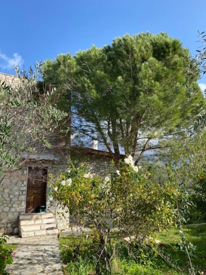 Als das Haus vor zwei Jahrzehnten gebaut wurde, habe ich die Pinie daneben gepflanzt. Es war ein kleines Bäumchen, und ich pflanzte es, um meinem Mann, der durch seine Kindheitserinnerungen mit einer pinienreichen Gegend verbunden war, seine Verpflanzung in die olivenreiche Mani zu erleichtern.