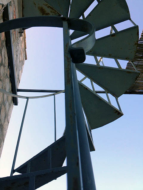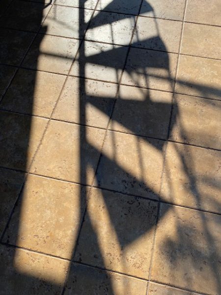 Unsere Wendeltreppe wirft ihren Schatten aufs Pflaster. Hinaufsteigen – hinabsteigen – derselbe Weg.