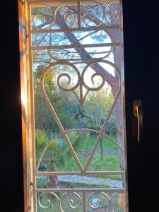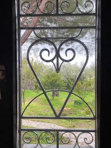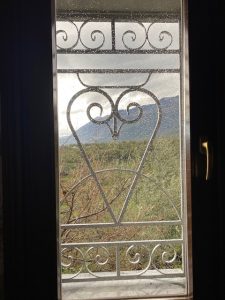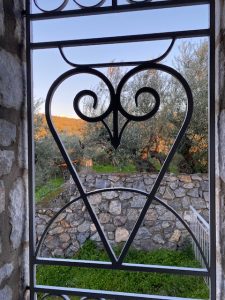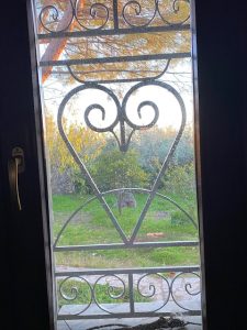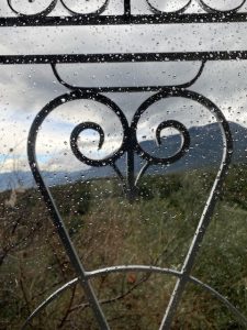 Drinnen im Warmen und Trockenen sitzen und durch die Fenster hinausschauen – ja, das ist eine Lustbarkeit. Unser Wohnraum hat 7 Fenster und eine Fenstertür, alle mit schmiedeeisernen „Eulen“ vergittert. Durch die schaue ich besonders gerne hinaus.