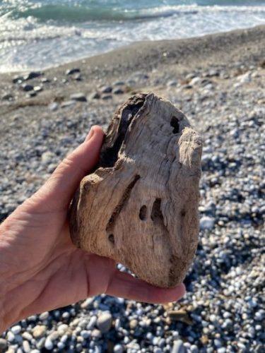 Der zweite Grund ist trivial: Schwemmholz ist gut für den Kamin. Wir haben zwar viel Oliven-Schnittholz, aber das sind große Stücke. Ich sammele kleinere Stücke am Strand, die fürs Anheizen besser geeignet sind.