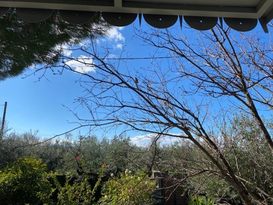 Heute ist ein kalter glänzender Tag. Ich öffne die Haustür und sehe natürlich als erstes …. die Katzen, die gefüttert werden wollen. Dann erinnere ich mich: ich wollte doch an jedem ersten Sonntag des Monats ein Foto vom Aprikosenbaum machen, der mich beim Hinaustreten als erstes begrüßt. Das Gezweig, sonnenüberglänzt, ist jetzt ganz kahl, allein ein vertrocknetes Blättchen hockt wie ein frierendes Winter-Vögelchen auf einem der Äste. Der weiße Rosenbusch trägt immer noch – immer wieder – Blüten, daneben ein paar rote Blüten am Hibiskusstrauch (Fotoprojekt Royusch).