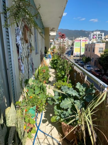 Immer wenn ich Almuths schöne Balkonberichte lese und anschaue, denke ich: Schade, auf meinem ist so wenig los. Dafür habe ich natürlich eine gute Ausrede: Ich bin selten hier, in der Athener Wohnung. Außerdem: Es gibt genug Grün rundherum, Bienen und andere Insekten haben also reichlich Nahrung. Also kümmere ich mich nur so weit um die Balkonpflanzen, dass sie von der Gießanlage am Leben erhalten werden, solange ich weg bin. Und kaufe ein paar neue Blumen fürs Auge, wenn ich komme.