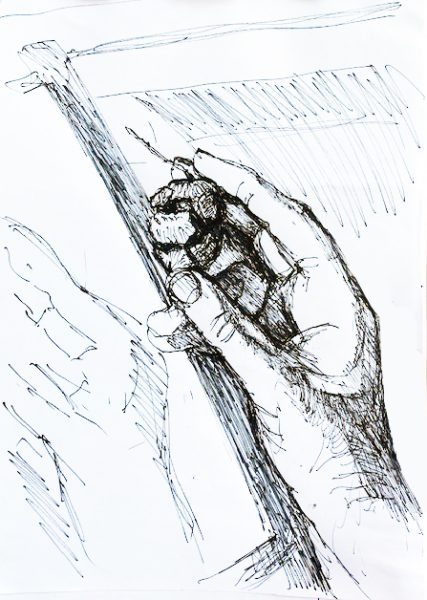Noch einmal das kleine zerklüftete Ebenbild der Weltkugel – der weibliche Zapfen der Zypresse – in meiner Hand. Diesmal habe ich langsamer gezeichnet.