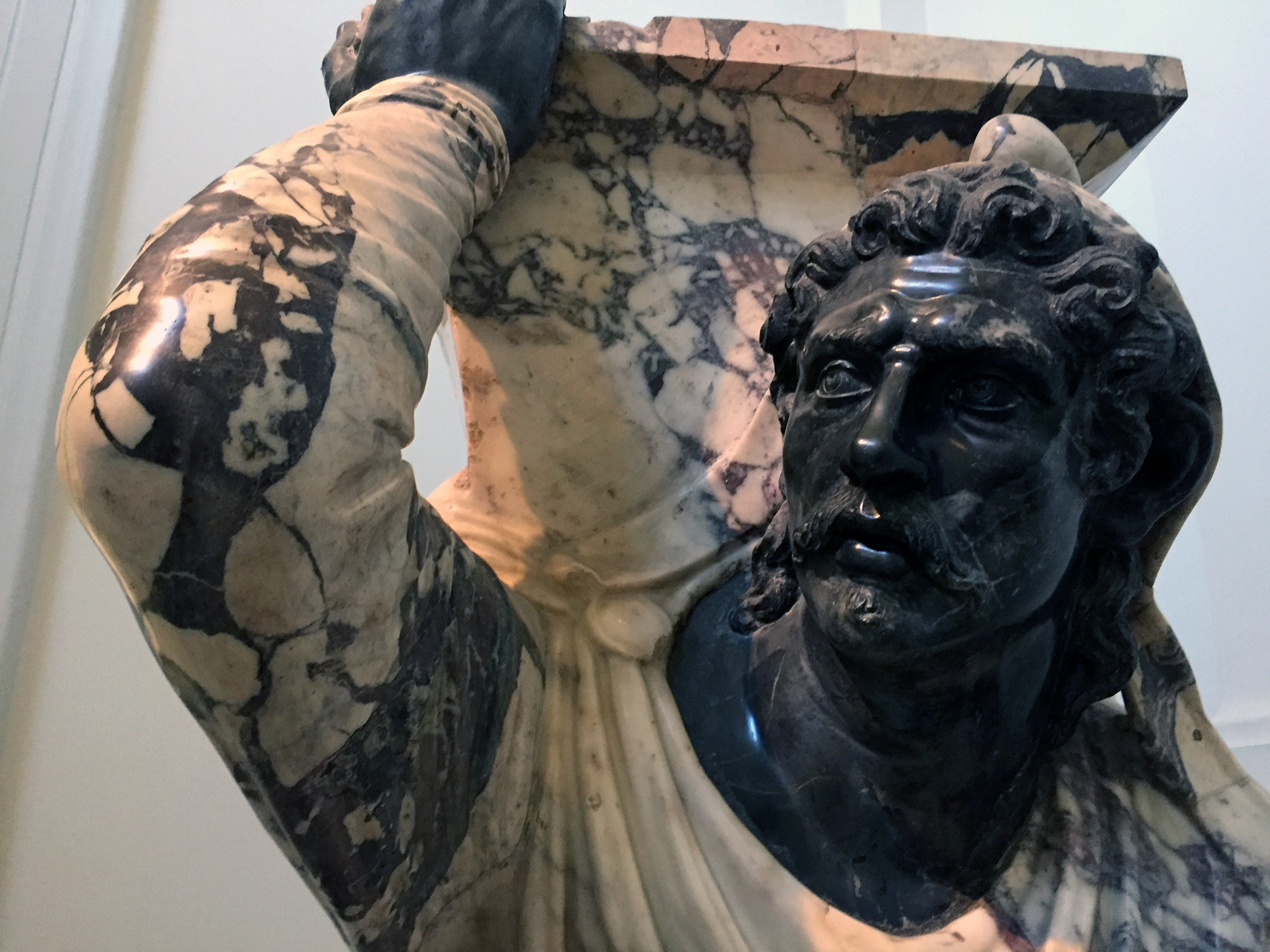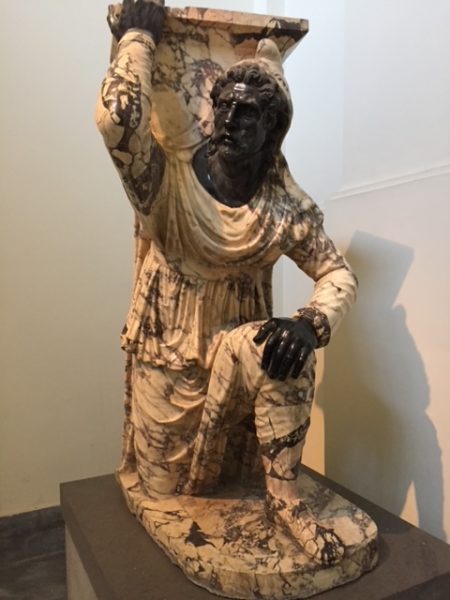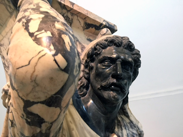 Wie dem auch sei: ein neuer Blick ist auch ein neues Kunstwerk. Und so blieb ich mit großer Bewunderung und einigen merkwürdigen Gedanken beim „knieenden Barbaren“ hängen, im 1. Jh kunstreich aus Pavonazetto-Marmor gehauen, der schwarze Kopf und die schwarze Hand aus Nero antico.
