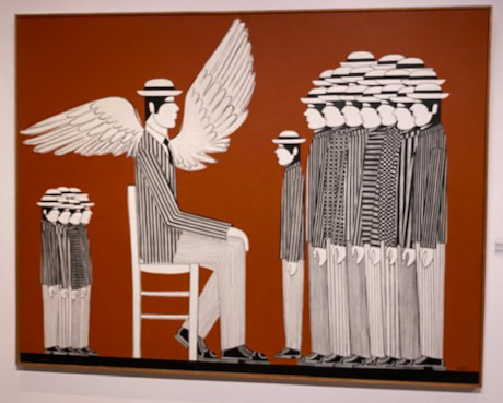 oder wie er, in quer- oder länggestreiftem Sacko, halb plastisch mit Seinesgleichen hintereinander gestapelt, auf einen roten Plakathimmel starrt, über den schattenhaft ein riesiger Negativ-Vogel fliegt.