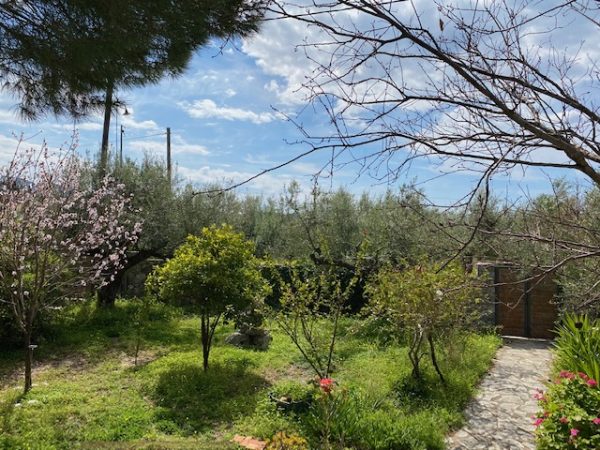 Aber darum geht es jetzt nicht. Sondern um die Entwicklung im Garten. Der Aprikosenbaum hat noch keine spektakulären Veränderungen aufzuweisen. Das einzige vertrocknete Blatt vom Februar-Bild sitzt immer noch am Zweig. Besonders freue ich mich an dem voll blühenden Mandelbäumchen – es ist immer spät dran, die meisten Mandelbäume sind schon verblüht -, an der einen roten Rose und dem grün überwucherten Boden. Der weiß blühende Rosenbusch und der rote Hibiskus haben kaum Blüten. Darüber ein Stück Himmel und ein bisschen vom Gezweig der riesigen Pinie, die unser doppelstöckiges Turmhaus überragt.