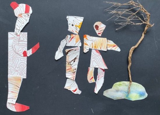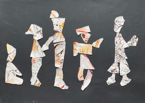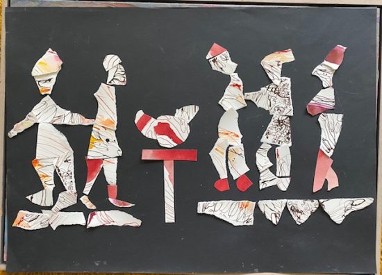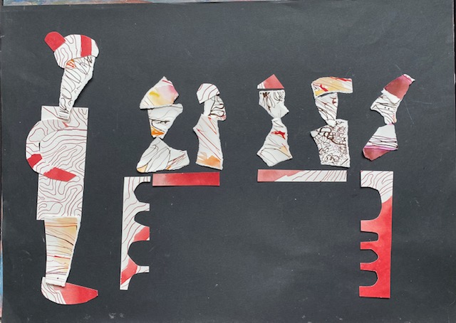 ich freue mich, meine Schnipsel in deinen Bildern zu sehen. Ich habe dieses mal einfache Formen gerissen, weil die Linien so dominant sind. Ursprünglich bildete ich eine Blume ab. Gestern fand Micha ein Foto von mir mit der nun gerissenen Zeichnung. Er war ganz traurig, dass ich sie „zerstört“ habe. Ich habe sie nicht zerstört, sie lebt in deinen Legebildern weiter. Ich frage ihn mal, ob er mir das Foto senden kann, es ist auf seinem Handy. Dann sende ich es dir weiter.