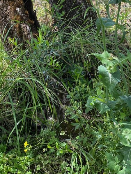 Eine Aushöhlung eines Ölbaumes, kaum zu entdecken hinter dem Kräutergewirr, hat sich die dritte unserer Katzen, die Frieda, als Wochenbett erkoren. Der Baum steht auf einem etwas entfernen Feld, also nicht in unserem Garten, und ist auch für wildernde Hunde frei zugänglich. Wenn das man gutgeht!