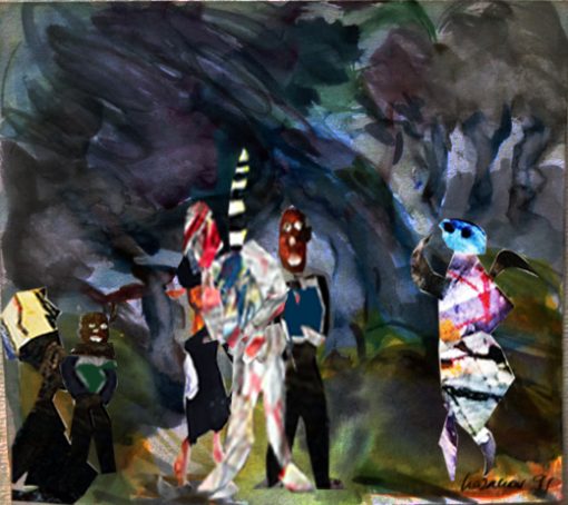 Die Gruppenbildungen auf der Bühne entstehen immer wieder neu. „Die ganze Gesellschaft“ all dieser so bunten Figuren zusammenzufassen, ist sicher nicht einfach. Die 2 Afrikaner stehen einzeln da, eine lose Zweiergruppe. Und der Hirt mit Hund bildet die neue 3. Gruppe.