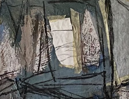 Auch dies ist mit Pigmenten, Kleister, Kohle, außerdem mithilfe von Klebestreifen grob befestigten grau-weißen Papierfetzen von der Rolle auf Leinwand entstanden und etwas neuer, vermutlich von 2018.