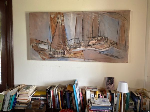 Das Bild hing bisher im Atelier, also musste ich dort für einen Ersatz sorgen. Natürlich spielen wieder Boote eine Rolle. Nennen wir es „Segelmacherei“.