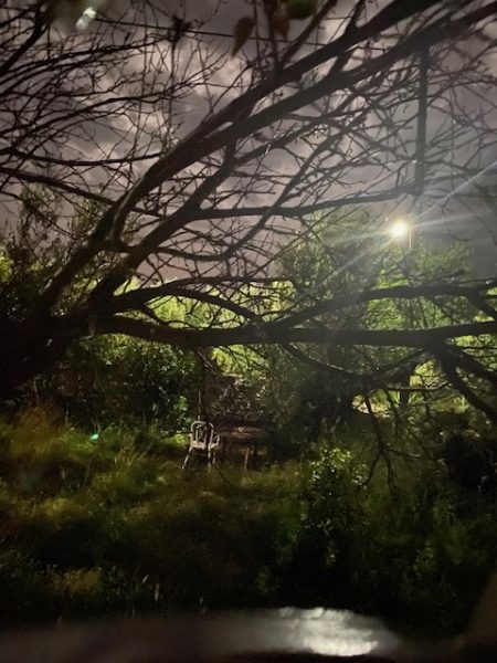 Das schwere Gewitter ist vorbei, der Regen hat aufgehört. Still und geheimnisvoll ist mein Garten in der Nacht, wenn er, von einer Straßenlaterne und dem zwischen wildem Gewölk ziehenden Mond beleuchtet, vor sich hinträumt.