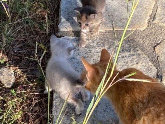 Wenn ich jetzt aus der Vordertür schaue, sehe ich Frieda mit einem wunderschönen Neuling. Sie hatte ihre Jungen im Loch einer Olivenwurzel auf einem Nachbargrundstück untergebracht und scheint nur dies eine behalten zu haben. Das brachte sie heute an.