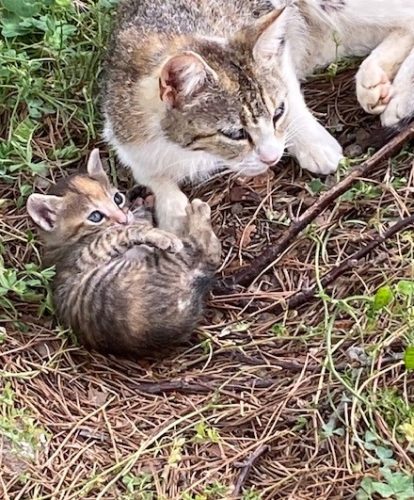 Ja, ich weiß. Nun muss ich erstmal jemanden vom Tierschutzverein finden, der sich auf den Weg macht – wir sind ja 10 km von der Stadt entfernt. Ich könnte natürlich versuchen, jedenfalls die eine, die friedlich ist, zum Arzt zu bringen, sobald ich sicher bin, dass sie keine Kleinen mehr nährt. Am schwierigsten wird es mit der Urmutter Prinkipessa sein, die ist verdammt vorsichtig und schlau.