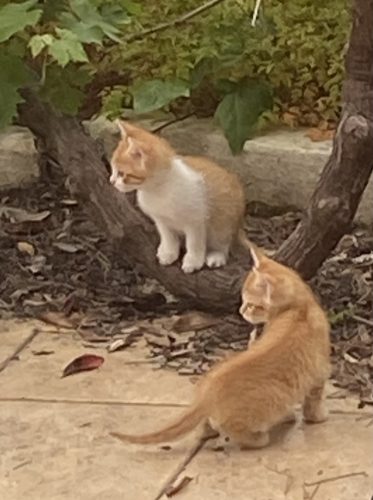 Sehe ich aus der Hintertür, erblicke ich zwei allerliebste Goldkätzchen. Sie scheinen zu Prinkipessas Wurf zu gehören und sind am weitesten in der Entwicklung. Aufgewachsen sind sie im Heizungskeller. Nun hat die Mama sie wohl zur Weinrebe geführt, die sie als Klettergerüst benutzen. Zwischendurch schauen sie immer wieder wie auf Kommando nach rechts, ob die Mama sich sehen lässt (durchs Fenster fotografiert).