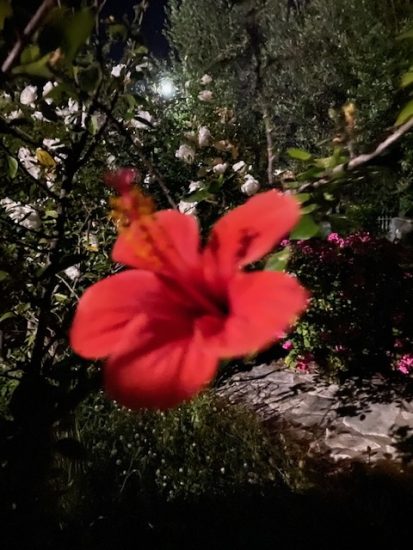 Nun bin ich in den Garten gegangen, um zu schauen, was mein roter Hibiskus nachts so treibt. Und vermelde; drei Blüten sind ganz offen genauso wie meine Augen, sie schlafen nicht. Zwei Blüten sind zusammengefaltet – ich werde morgen nachschauen, ob sie sich wieder öffnen. Und dann gibt es noch eine Knospe.