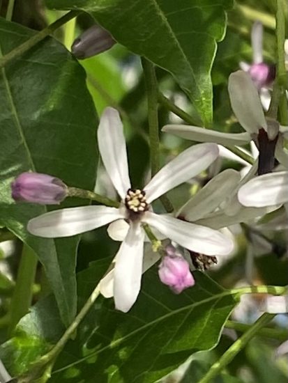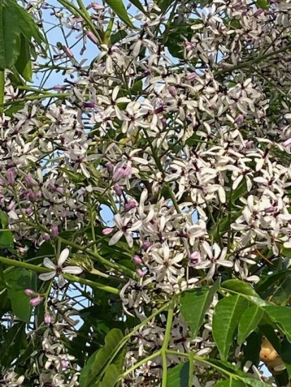 Danke, genau das ist er…Noch nie gehört. Zedrachbaum…, Persischer Flieder, chinesischer Hollunder, Paternosterbaum. ..Familie der Mahagonigewächse. Wiki weiß: „Die angenehm duftenden Blüten sind radiärsymmetrisch und fünfzählig mit doppelter Blütenhülle. Die meist zwittrigen oder männlichen, kurz gestielten Blüten sind etwa 10 Millimeter lang und 15 bis 19 Millimeter breit. Die fünf kleinen, grünlichen bis bräunlichen, feinhaarigen und spitzen Kelchblätter sind etwa 1,5–2 Millimeter lang. Die fünf weißen, weiß-hellpurpur oder -fliederfarbenen bis etwas -purpurroten Kronblätter sind etwa 10 Millimeter lang, verkehrt-eilanzettlich und ausladenden. Die Staubfäden der zehn bis zwölf Staubblätter sind zu einer 8 Millimeter langen, engen, rötlichen bis dunkelvioletten oder violetten, manchmal weißen, rippigen und oben gezähnten Röhre verwachsen, die aufrechten Staubbeutel sind pfeilförmig und sitzen innen, oben. Der auf einem Diskus stehende, oberständige Stempel ist blassgrün und besteht aus einem drei- bis sechskammerigen Fruchtknoten, einem langen, dicken, eingeschlossenen Griffel und einer drei- bis sechslappige, keulenförmigen Narbe.“