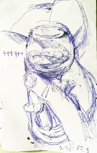 Noch eine dritte Skizze: das bewährte Motiv der Hand mit dem Weinglas, im halben Liegen gezeichnet, sehr nah und ein bisschen verzerrt. Keine Überblendung, dafür  „Weichzeichnung“ mithilfe eines Fotoshop-Filters (Ölmalerei).