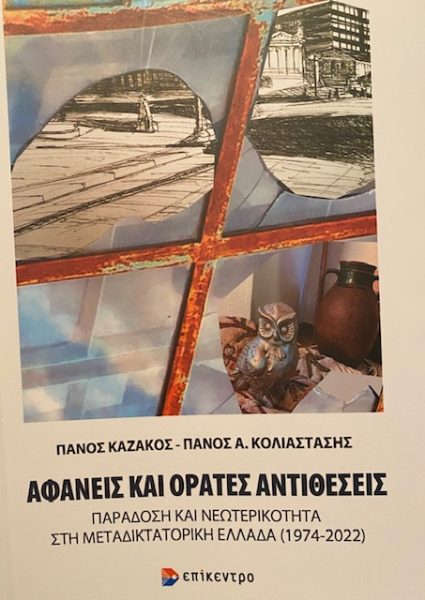 Das neueste Buch meines Mannes ist gerade herausgekommen. Es geht um die Überlagerungen und Konflikte zwischen traditionellen Wertvorstellungen und Moderne, in Politik und Ökonomie.  Der Verlag hat eine Collage von mir als Vorlage fürs Titelbild akzeptiert: durch das zerbrochene Fenster einer aufgegebenen Fabrik, in dem sich der Himmel spiegelt, blickt man auf den Platz der Akademie in Athen (Zeichnung) und auf ein Stillleben mit der unvermeidlichen Eule.