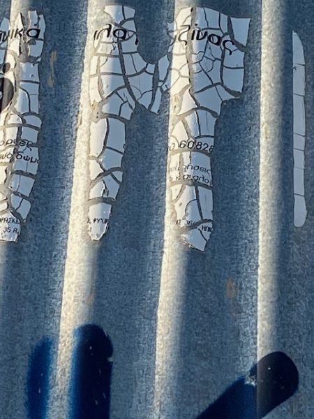 Seltsame Muster waren durch Witterungseinflüsse aus irgendwann aufgeklebter Reklame – vermutlich für Kücheneinrichtungen …