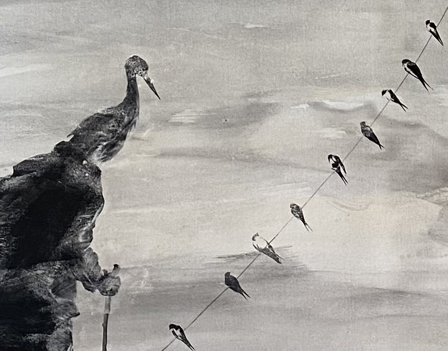 Ein Reiher dient dem Wanderer als Haupt, und auf einem langen Draht von hier bis zum „Haus jenseits der Welt“ (so der Titel) aufgereihte Schwalben weisen ihm den Weg. „Gemalt“ ist es mit Akryllfarben, Asche, Bleistift auf Leinwand. Bei meiner Suche im Internet fand ich noch andere seiner enigmatischen Vogelbilder (hier).
