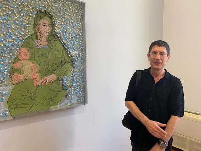 Die Madonna („Mutter und Kind“ ist der Titel) beschaue ich mir genauer. Sie ist doppelbödig gearbeitet. Die Zeichnung befindet sich auf einer Folie, und darunter, mit etwas Abstand, gibt es einen festen Boden, auf den die Farben großflächig und ohne Schattierungen aufgetragen sind. Die Madonna ist mit militärischem Kaki bekleidet. Das Jesuskind ist durch eine Puppe ersetzt. Der bei orthodoxen Ikonen übliche Goldboden wird durch Bonbonpapier, Aluminium und Draht kunstvoll imitiert.