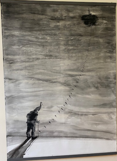 Ein Reiher dient dem Wanderer als Haupt, und auf einem langen Draht von hier bis zum „Haus jenseits der Welt“ (so der Titel) aufgereihte Schwalben weisen ihm den Weg. „Gemalt“ ist es mit Akryllfarben, Asche, Bleistift auf Leinwand. Bei meiner Suche im Internet fand ich noch andere seiner enigmatischen Vogelbilder (hier).