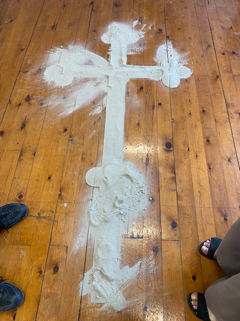Das Bild ist, warum auch immer, thematisch den „Reflexionen: Christliche Tradition in der bildenden Kunst“ zugeordnet. An der Rückwand des Raumes dominiert ein Madonnenbild, und ich strebe drauf zu. Dabei trete ich, wie vor mir schon so mancher andere Besucher, auf ein großes mit Sand auf den Boden „gemaltes“ byzantinisches Kreuz (byzantinisch, weil das Kreuz an seinen Enden in Blüten übergeht)
