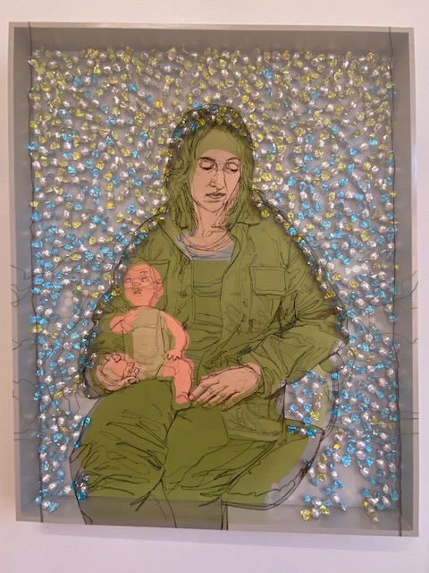 Die Madonna („Mutter und Kind“ ist der Titel) beschaue ich mir genauer. Sie ist doppelbödig gearbeitet. Die Zeichnung befindet sich auf einer Folie, und darunter, mit etwas Abstand, gibt es einen festen Boden, auf den die Farben großflächig und ohne Schattierungen aufgetragen sind. Die Madonna ist mit militärischem Kaki bekleidet. Das Jesuskind ist durch eine Puppe ersetzt. Der bei orthodoxen Ikonen übliche Goldboden wird durch Bonbonpapier, Aluminium und Draht kunstvoll imitiert.