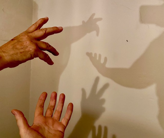 Es gefällt mir, unsere Hände, die diese Schatten-Kunst hervorbringen, mit aufs Bild zu bringen und nicht zu verstecken. Damit klar ist: Materielos ist nur das geistige Bild, das wir uns von einer Sache machen. Sobald wir dieses Bild ins Sichtbare bringen wollen, sind wir an die Bedingungen der materiellen Welt gebunden. Das rein Geistige ist unsichtbar, das elektronisch erzeugte Sichtbare ist nicht materielos. Es ist höchstens materiearm, entblösst von den Düften, dem Gewicht, der Ertastbarkeit der natürlichen Welt, die uns zu unserem Glück immer noch umgibt.