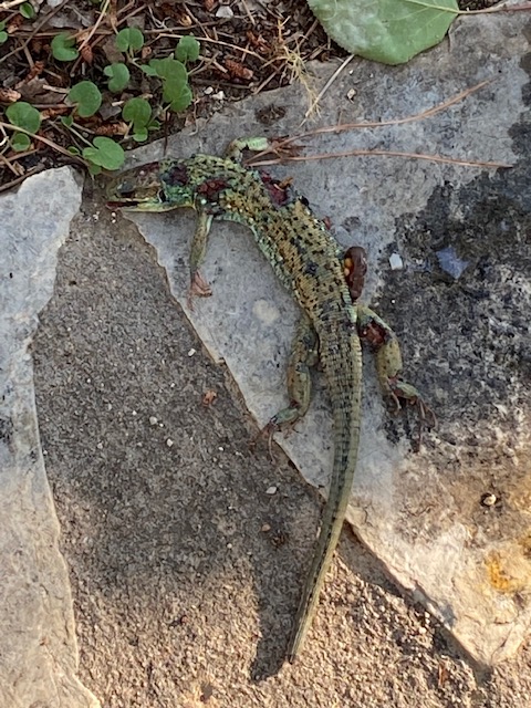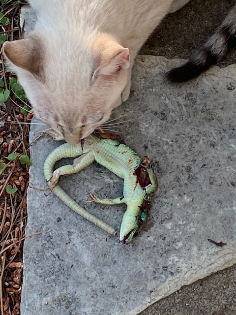 Heute haben die Katzen eine wunderschöne Echse ermordet. Ich sah das tote Tier, als die kleine Lin sich an ihr verköstigte.