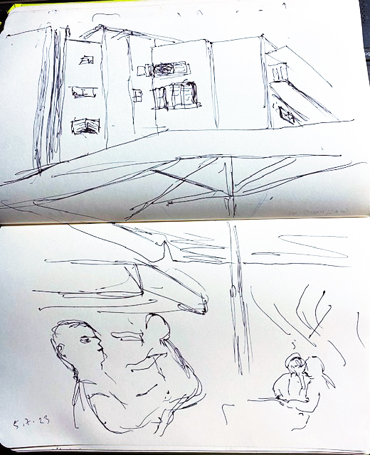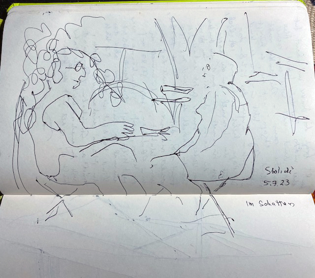 Ich habe Zeit, lese ein bisschen, notiere Gedanken in meinem Skizzenbuch, beobachte ein Ehepaar mit Kleinkind und einer Freundin, etwas weiter entfernt zwei Frauen. Schließlich skizziere ich sie verstohlen.