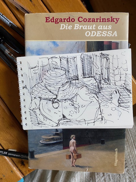 Den Winzlingsblock legte ich auf den Band mit Kurzgeschichten des argentischen russisch-stämmigen, in Paris lebenden Schriftstellers Edgardo Cozarinsky, den mein Sohn mitbrachte und gerade ausgelesen hat. Ich las die Titelgeschichte und empfand, dass meine kleine Zeichnung recht gut zum leichten Erzählstil des Autors und zur unbekannten Hutmacher-Gehilfin der Erzählung passt.