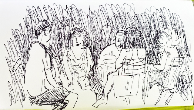 Heute im Gartencafe skizzierte ich mal wieder eine Tischgesellschaft. Sie saß vor einer dunkelgrünen Blätterwand.