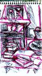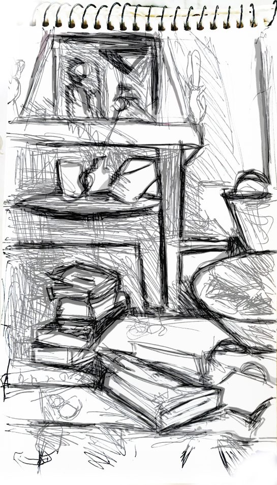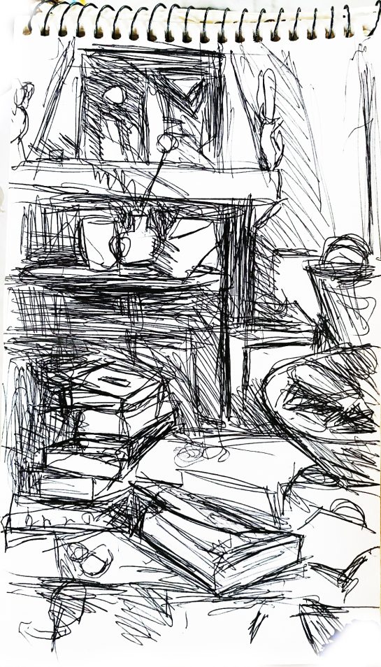 Heute machte ich eine Skizze der Bücherstapel und anderen Dinge auf dem Couchtisch, der seinerseits vor einem runden Tisch und dem Kamin steht. Ich benutzte einen winzigen Block und Kugelschreiber.