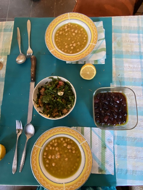 Kichererbsen gabs vorgestern – als Suppe zubereitet mit kleingehackten angedünsteten Zwiebeln, Meersalz, Zitronensaft und Olivenöl (eigene Ernte). Kichererbsen kannte ich früher nicht, inzwischen gehören sie in jeder Zubereitungsform zu meinen Lieblingsspeisen. Dazu gabs Roka-Salat mit grobem Zwieback, Nüssen und Balsamiko-Essig, und natürlich Kalamon-Oliven aus Kalamata. Mmm, lecker!