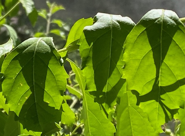 Mir zugewandt lagen die Blattunterseiten, durchlichtet von der Sonne. Oben krümmten sie sich, so dass die Sonne sie voll beschien und sie aufglänzen ließ. Der Rest der Blätter samt ihren Stengeln und den haltenden Ästchen erschien als Schattenriss auf der durchleuchteten Blattunterseite. Kurzum, die Blätter ergänzten sich selbst durch den Schattenriss.