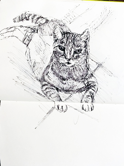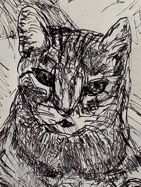 Heute saß die scheue Prinkipessa recht zutraulich unter dem Tisch, und ich fühlte mich bemüßigt, sie zu zeichnen. (Wo hat sie nur ihre vielen neuen Kinder? Sind die etwa schon wieder verloren gegangen?) Ihre anscheinende Ruhe hinderte sie nicht daran, pausenlos ihre Position zu verändern: mal guckte sie hierlang, mal dorthin, mal streckte sie das Bein, mal hob sie den Kopf … und so wurde aus meinen Bemühungen nicht viel.