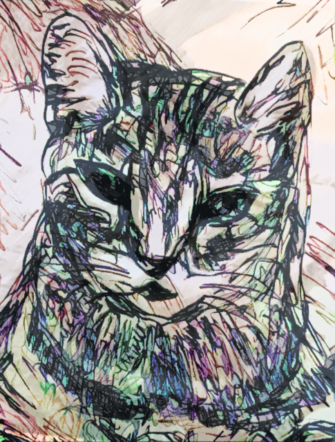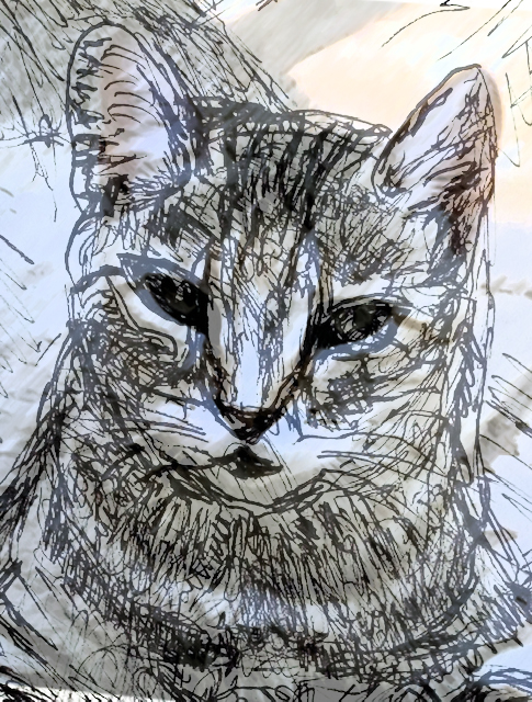 Am interessantesten war mir der Kopf, mit dem ich weiter herumexperimentierte. Und so entstand aus der Kombination von Foto und Zeichnung eine Reihe von Katzenportraits. Ich zeige hier mal die Originalzeichnung und drei Überblendungen, davon zwei auch digital bearbeitet sind.