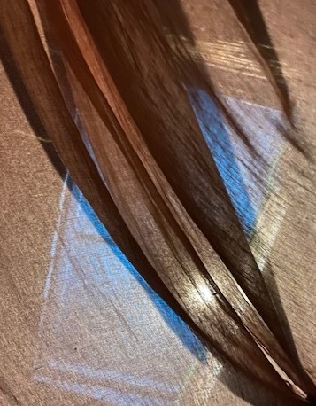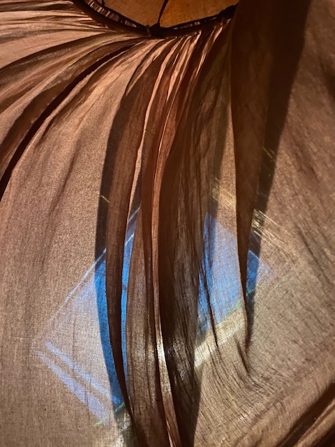 Mein Moskitonetz mit den langen auslaufenden Faltungen regt den Pinseltraum sogar noch stärker an als die Reproduktion eines Hartung-Bildes, zumal das durchscheinende Blau des Parallelogramms einen fein kontrastierenden Grund bildet.