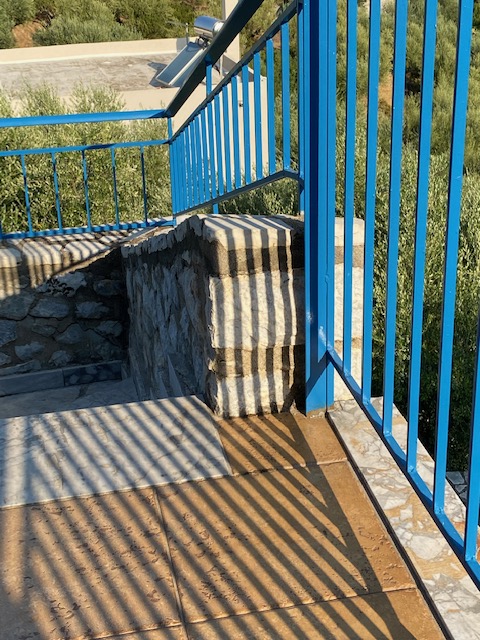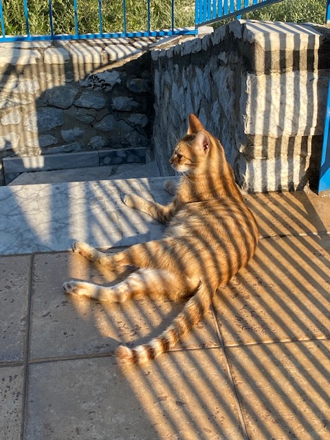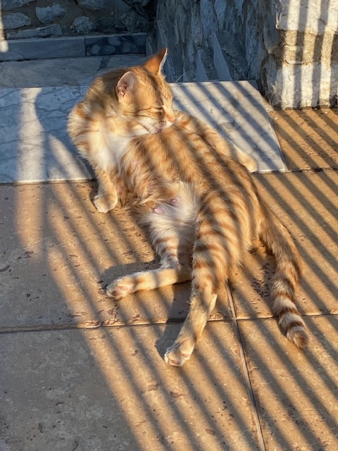 Theo ist eine goldgelbe getigerte Katze. Als sie mich gestern zusammen mit zwei Kumpaninnen auf der Turmterrasse besuchte, legte sie sich dekorativ in den Schatten, den das Geländer auf die Fliesen malte.