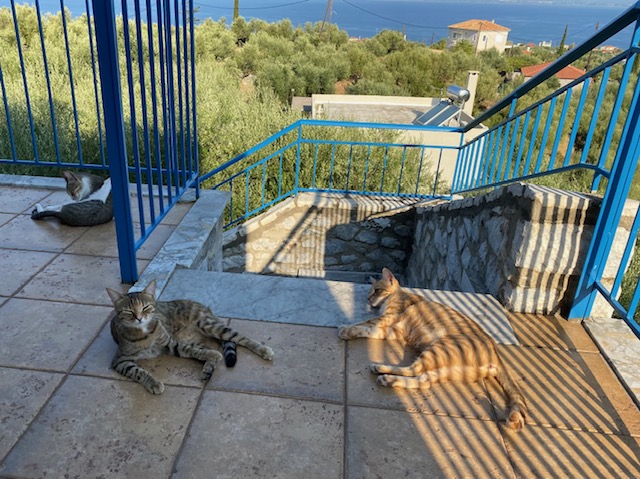 Oder ein Harem mit Eunuchenwächtern….Auch das wird wohl nicht funktionieren. Bisher tröstet mich, dass einige verschwinden und einige nur ab und zu aufkreuzen. Sie scheinen sich hier in der Gegend noch andere Fütterer zugelegt zu haben. Nur die beiden kleinen weißen Kater, die mit ihren grauen Schwänzen und blauen Augen ein sehr herziges Paar bilden, sind dauernd hier, schlafen oft auf der Matte. Denen wünsche ich ein gemütliches Heim, wo sie sich sehr gut machen würden. Willst du sie nicht vielleicht haben?