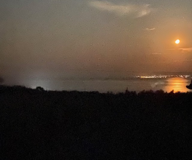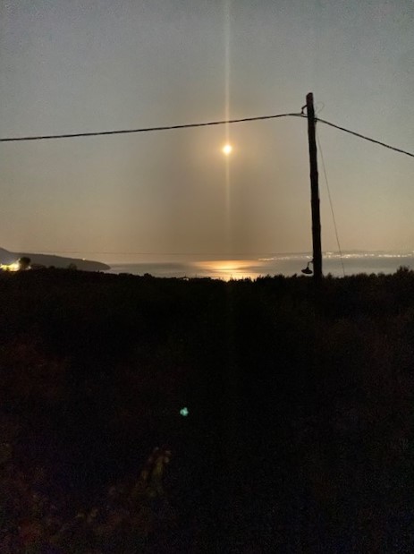 Grad wächst ja der Mond wieder zum vollen Rund an – zwei Augustmonde, das ist ein seltenes Geschenk. Hier sieht man ihn in der Nacht vom 26. auf den 27. August um 1.23 Uhr über dem Messenischen Golf, die Lichterkette der Stadt Kalamata überstrahlend. Das fahle Licht eines beliebten Strandcafes links bildet einen interessanten Kontrast.