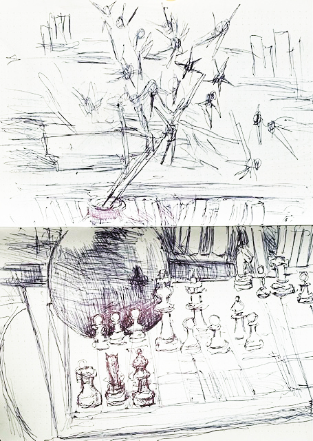 Schachfiguren und schwarze Kugelvase (tägliches Zeichnen und ein paar kleine Beobachtungen))