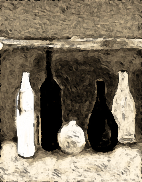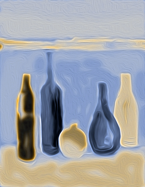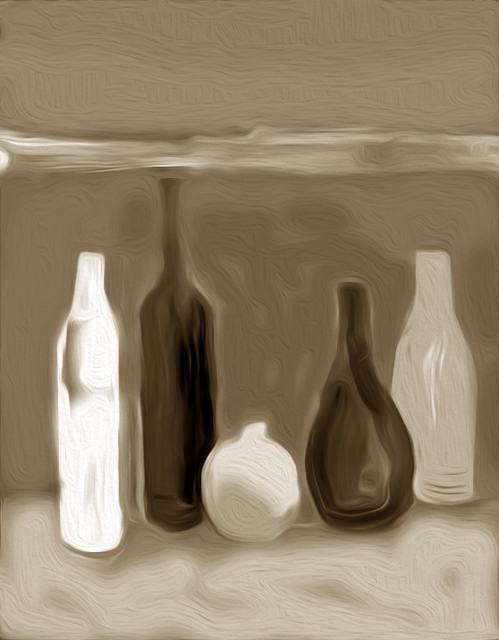 Ich holte mir ein paar Vasen und Flaschen, baute sie vor mir auf, nahm den dicken Borstenpinsel und begann, das Bild zu übermalen. Dann setzte ich mich an den Computer und „vollendete“ das Werk mithilfe des feineren digitalen Pinsels.