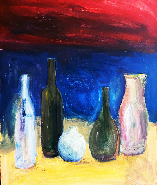 Das digital bearbeiteten Bild ubermaltest Du, und das finde ich besonders schön. Da sieht der Himmel wie Abendrot aus. und die Flaschen wirken eine wie die andere schön in den Farbgebungen.