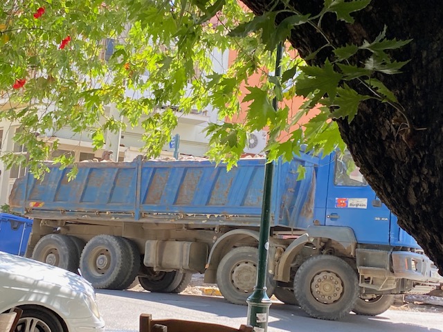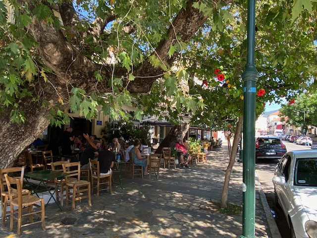 Heute sitze ich, einen Imbiss nehmend, vor dem Lokal Thiassos (Theatertruppe) unter den schönen Platanen und beobachte, was so auf der Straße vor sich geht.
